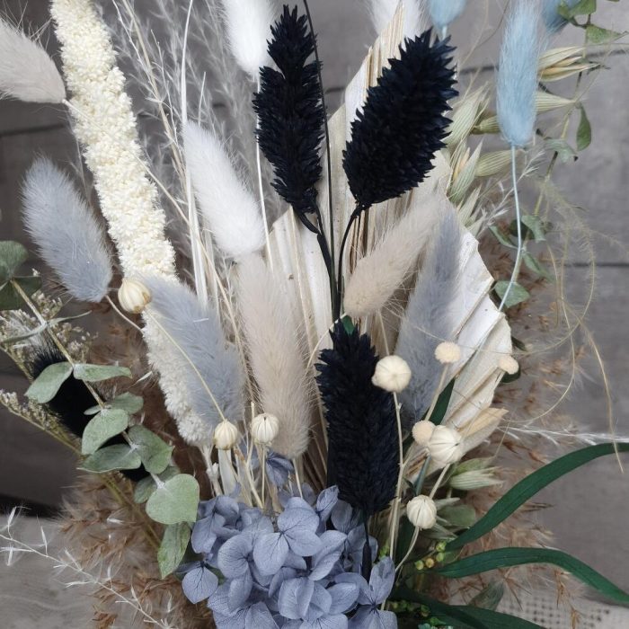 гортензия стабилизированная пучок – 1 шт.мини пампас – 1 шт.ботао – 3 шт.сетария сухоцвет – 1 шт.камыш декоративный – 1 шт.стабилизированный эвкалипт – 1 шт.Эвкалипт сухоцвет – 3 шт.Лагурус – 10 шт.Фаларис – 4 шт.копье пальмы – 1 шт.лен сухоцвет – 1 шт.аурея белая – 1 шт.статица стабилизированная – 1 шт.Ваза стеклянная – 1 шт.