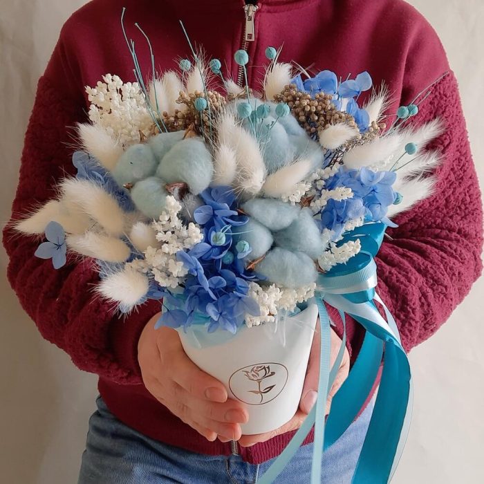 Хлопок натуральный – 3 шт.гортензия стабилизированная – 1 шт.лагурус пучок – 1 шт.перо декоративное – 1 шт.лен натуральный пучок – 1 шт.камыш декоративный – 1 шт.Озотамнус – 2 шт.ветки декоративные – 25 шт.Оазис для сухоцветов – 1 шт.Кашпо картонное – 1 шт.Лента атласная – 3 шт.