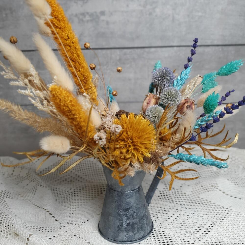 Эхинопс – 4 шт.Фаларис – 4 шт.Сетария – 3 шт.Лагурус (сухоцвет) – 10 шт.Лимониум – 1 шт.Лен – 2 шт.маковые коробочки сухоцвет – 2 шт.вейник пучок – 1 шт.стабилизированная лаванда – 3 шт.Колоски – 4 шт.стабилизированная статица – 1 шт.кашпо кувшин металическая – 1 шт.