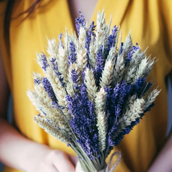 Лаванда (сухоцвет) – 85 шт.Лента – 1 шт.Пшеница (сухоцвет) – 15 шт.