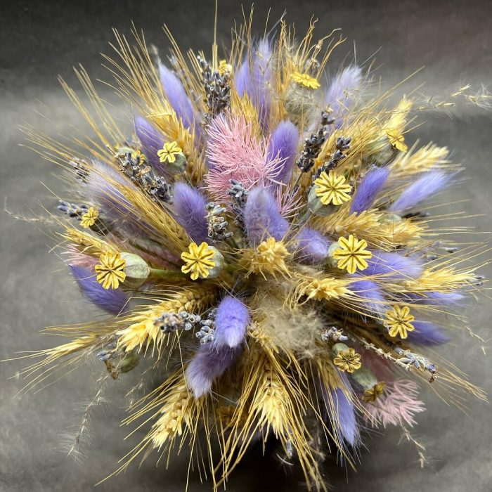 Колоски пшеницы – 20 шт.колосья мака – 10 шт.Лаванда (сухоцвет) – 15 шт.Лагурус (сухоцвет) – 20 шт.Кашпо керамическое – 1 шт.Оазис флористический – 1 шт.