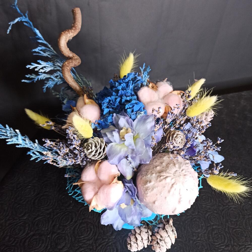 Кашпо керамическое – 1 шт.Оазис флористический – 1 шт.Лаванда (сухоцвет) – 1 шт.Гортензия – 1 шт.Хлопок – 3 шт.Лагурус – 6 шт.цветы искусственные – 4 шт.Шишки натуральные – 5 шт.Туя – 3 шт.Тыква декоративная – 1 шт.