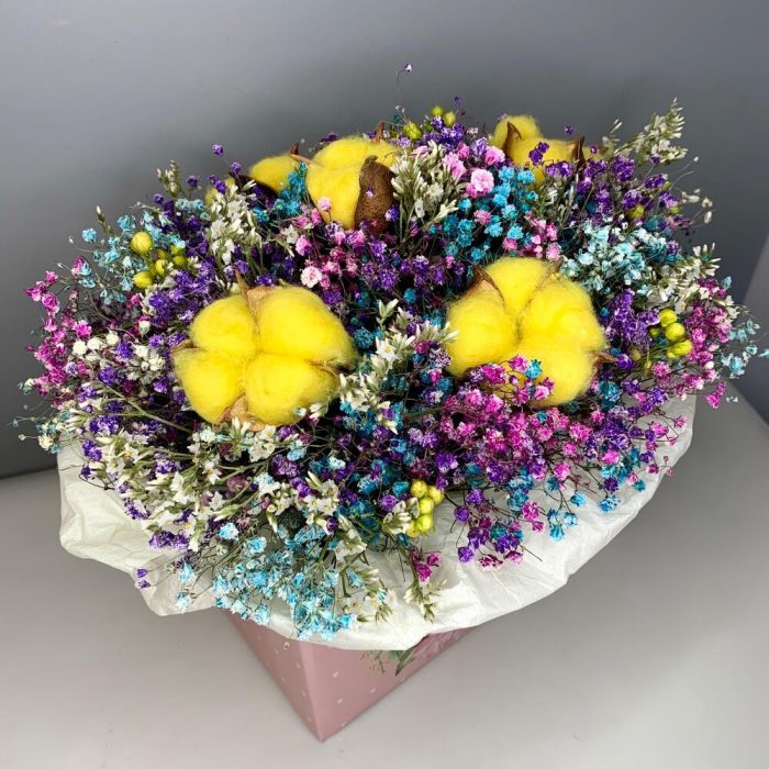 Разноцветная композиция из сухоцветов в нежной коробке