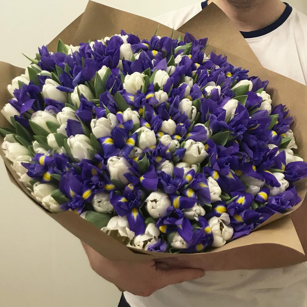 Букет из ирисов и тюльпанов "White Blue"