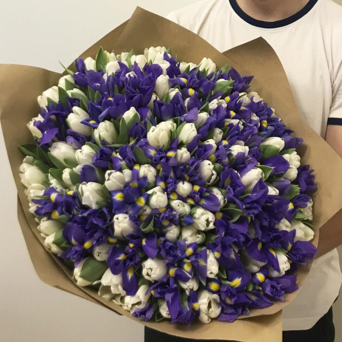 Букет из ирисов и тюльпанов “White Blue”