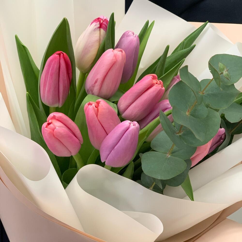 Тюльпан – 15 шт.Эвкалипт – 1 шт.Дизайнерская упаковка – 2 шт.Атласная лента – 1 шт.