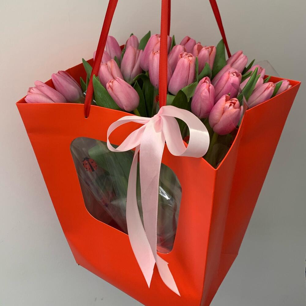 Тюльпан – 25 шт.дезайнерская упаковка – 1 шт.Атласная лента – 1 шт.Пакет – 1 шт.