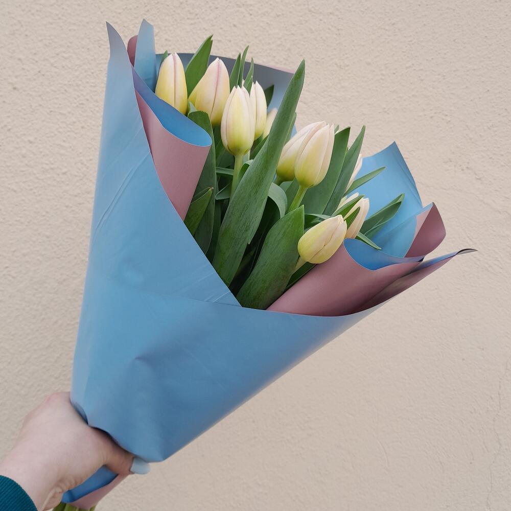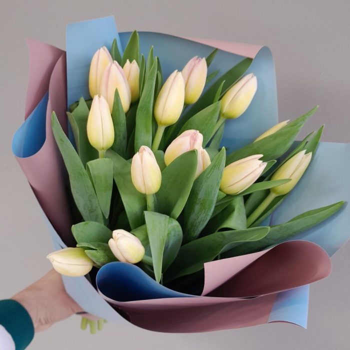 Тюльпан – 15 шт.Лента атласная – 2 шт.Упаковка дизайнерская – 3 шт.