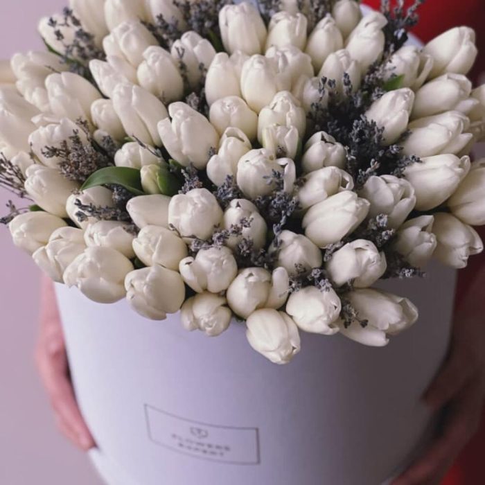 Тюльпан белый – 101 шт.Лаванда – 1 шт.Коробка шляпная – 1 шт.