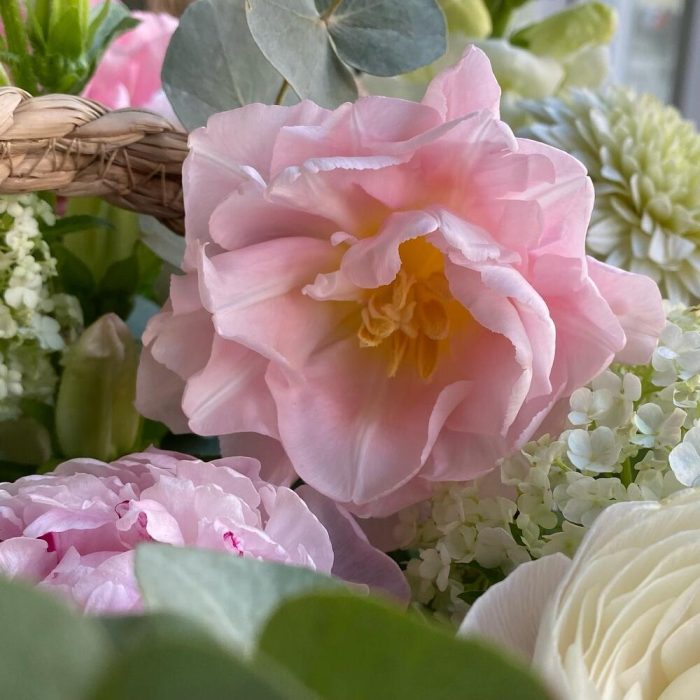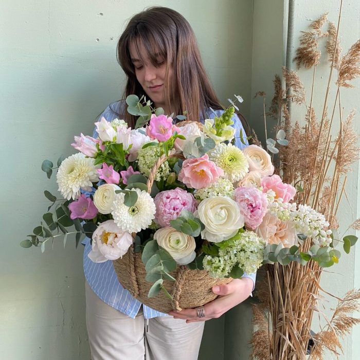 Лукошко из сада с ранункулюсами и пионами