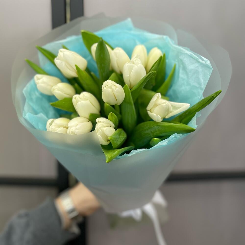 Тюльпан белый – 15 шт.Пленка дизайнерская – 4 шт.Тишью – 2 шт.
