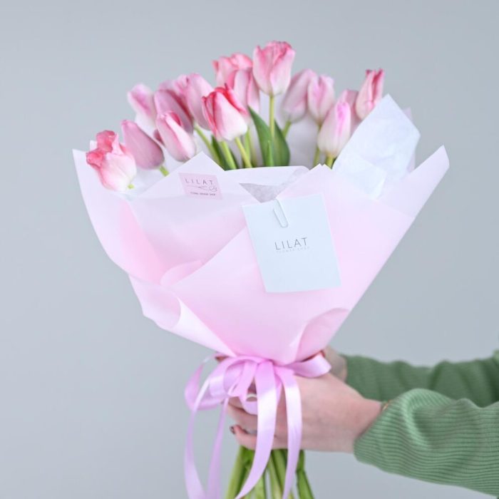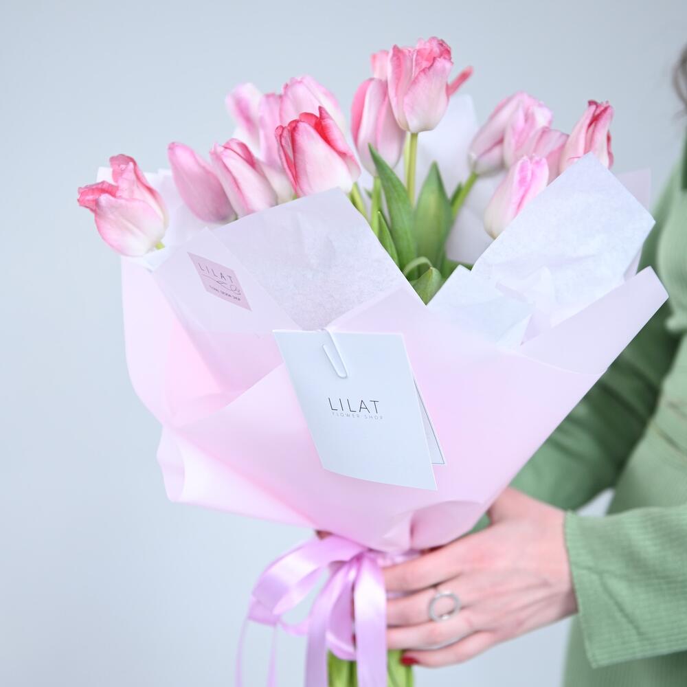 Тюльпан – 15 шт. Упаковка дизайнерская – 1 шт. Открыточка с вашими пожеланиями – 1 шт. инструкция по уходу за цветами – 1 шт.